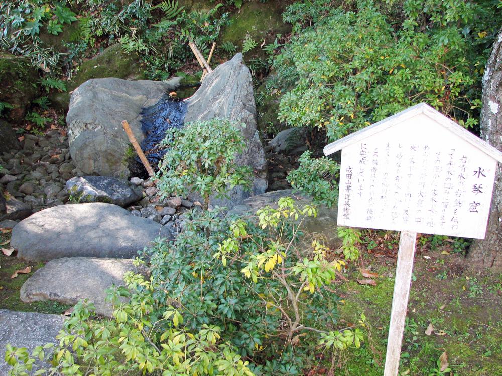 岩清水が岩盤をつたって手水鉢の窪みに溜まる。溢れた水が下に埋められた常滑大甕(とこなめ おおがめ)の中に落下すると、その音が四方に反響し名琴の音を響かせる。